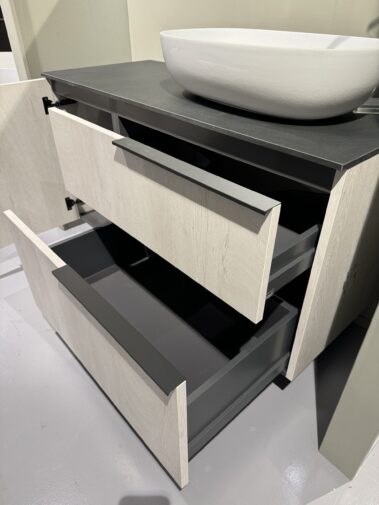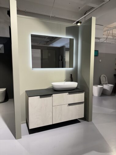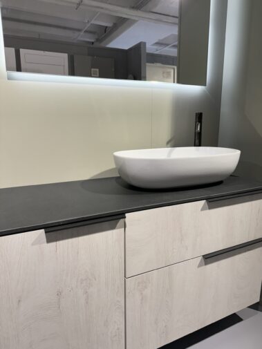 Una soluzione moderna e raffinata composta da base con finitura Quercia Light, top in elegante contrasto scuro e lavabo da appoggio dalle linee morbide. Completa di specchio retroilluminato a LED che dona luminosità e stile all’ambiente.