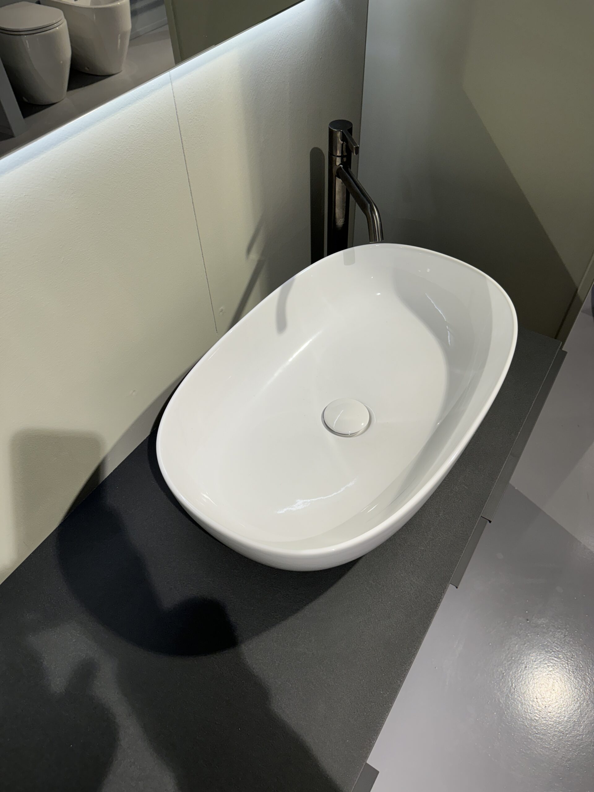 Una soluzione moderna e raffinata composta da base con finitura Quercia Light, top in elegante contrasto scuro e lavabo da appoggio dalle linee morbide. Completa di specchio retroilluminato a LED che dona luminosità e stile all’ambiente.