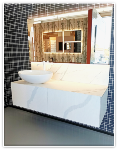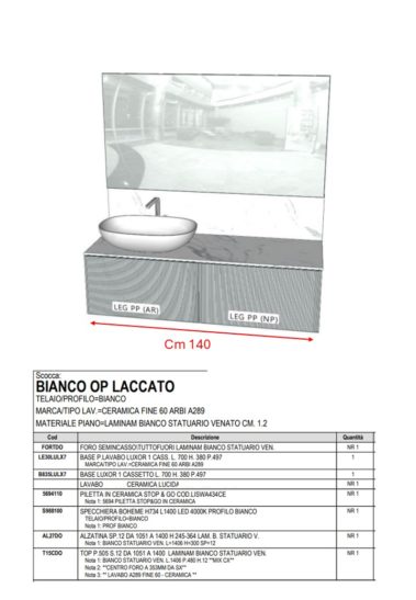 composizione composta base due cassetti larghezza 140cm, finitura bianco opaco laccato e lavabo da appoggio in ceramica bianca lucida. Specchiera Boheme con luce led.