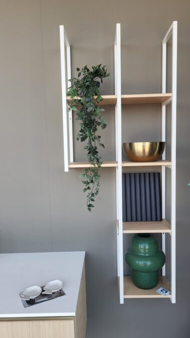 La composizione si completa con la specchiera Soul, diametro 100cm e il pensile in alluminio con ripiani in legno.