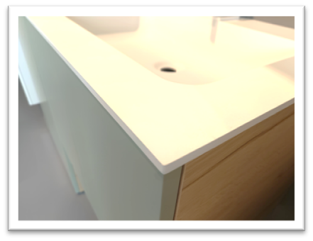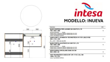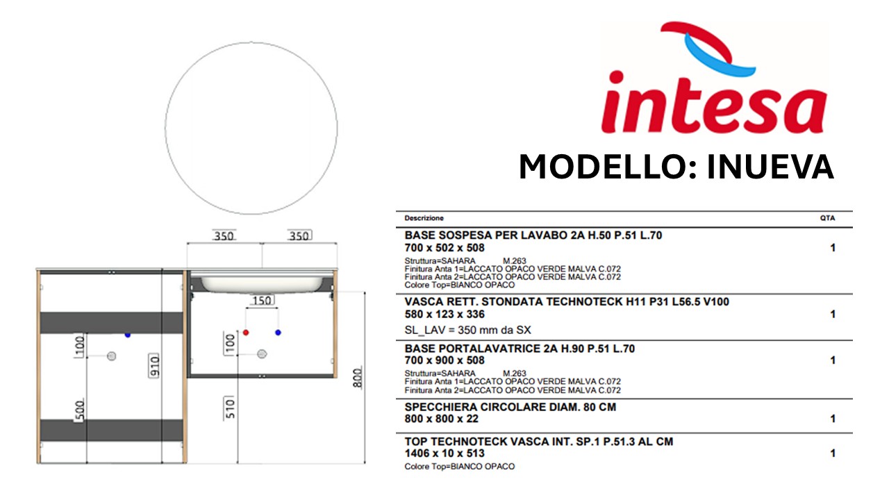 Composizione bagno moderna con base sospesa per lavabo da 140 cm, inclusa vasca rettangolare stondata, base a terra porta lavatrice da 70 cm e specchiera circolare diametro 80 cm.