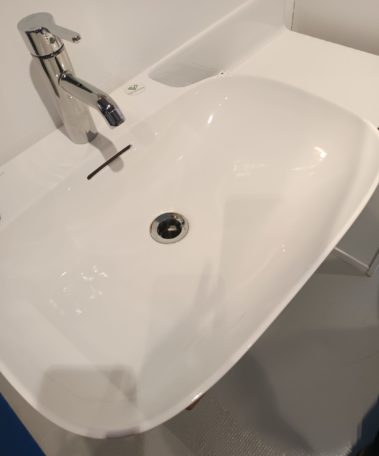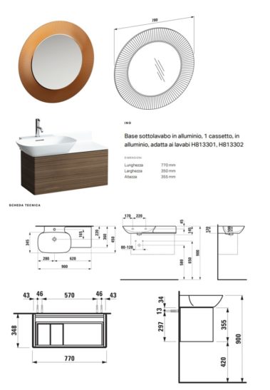 composizione composta base un cassetto 770x350x348, finitura noce daniele e lavabo con mensola a destra in ceramica bianca, 90×45.