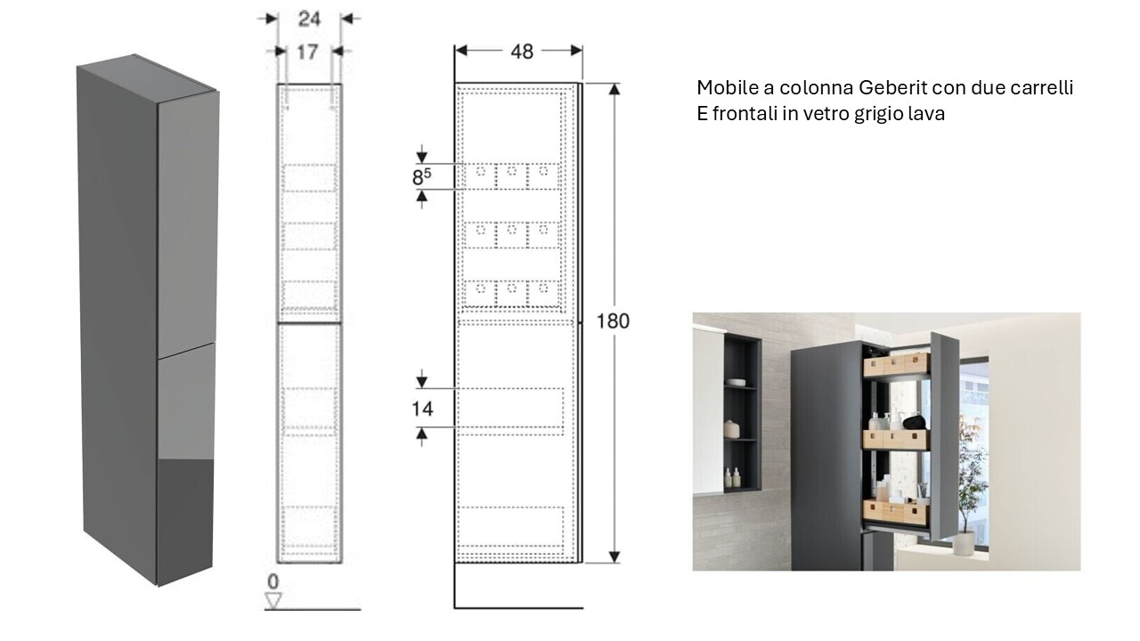 Mobile a colonna verticale Geberit Acanto, formato da due carrelli scorrevoli in vetro grigio lava.